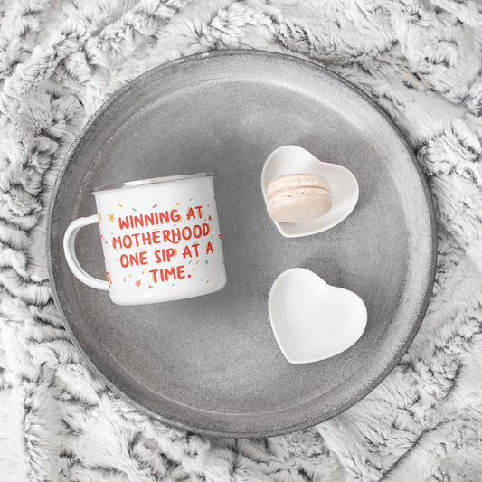 • Winning at Motherhood – 12 oz Lightweight Enamel Mug (Perfect for Camping & Everyday Use)